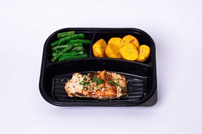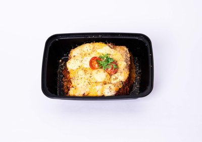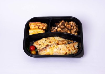TILAPIA GRATINADA, CHAMPIÑONES SALTEADOS CEBOLLA CARAMELIZADA Y MADURO
