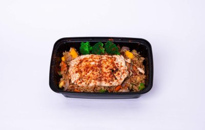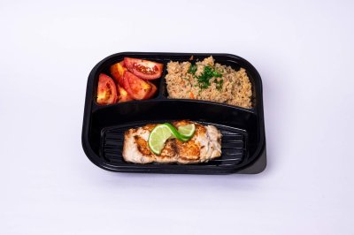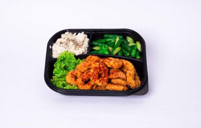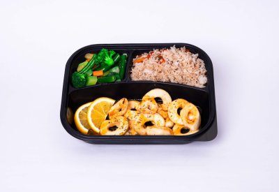 ANILLOS DE CALAMAR EN SALSA CITRICA, CON ARROZ DE PIMIENTOS Y VEGETLES AL VAPOR