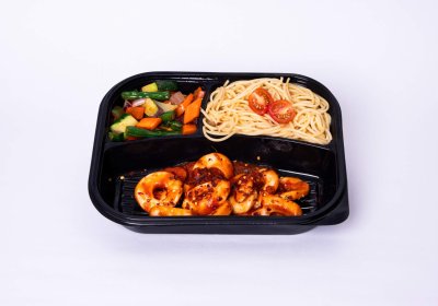 CALAMARES EN SALSA ENDIABLADA,PASTA LARGA Y VEGETALES SALTEADOS