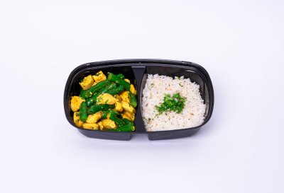 POLLO AL CURRY CON HABICHUELAS Y ARROZ BLANCO