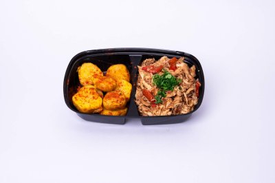 POLLO DESMECHADO CON TERIYAKI, PIMIENTOS Y PAPA AMARILLA