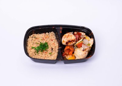ROLLO DE POLLO RELLENO DE VEGETALES, ACOMPAÑADO DE QUINOA