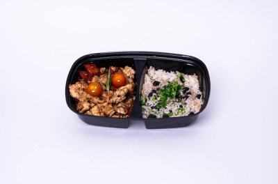 POLLO MOLIDO SALTEADO CON PIMIENTOS Y ARROZ BLANCO CON FRIJOLES NEGROS