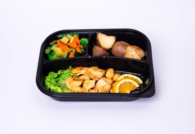 POLLO A LA NARANJA, CON CASCOS DE PAPA Y VEGETALES AL VAPOR